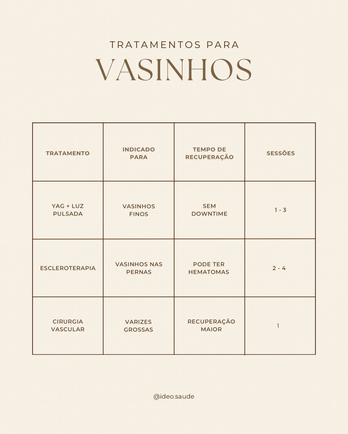 Laser ou esclero? A verdade é que não existe um único melhor — existe o ideal pro seu tipo de vasinho. E o melhor de tudo: essa é a época perfeita pra tratar!Com o clima mais ameno e menos exposição ao sol, tanto o laser YAG + luz pulsada quanto a escleroterapia têm resultados melhores