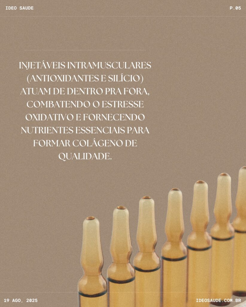 ✨ Injetáveis intramusculares (antioxidantes e silício) – que agem de dentro pra fora, combatendo o estresse oxidativo e garantindo matéria-prima para novas fibras.
