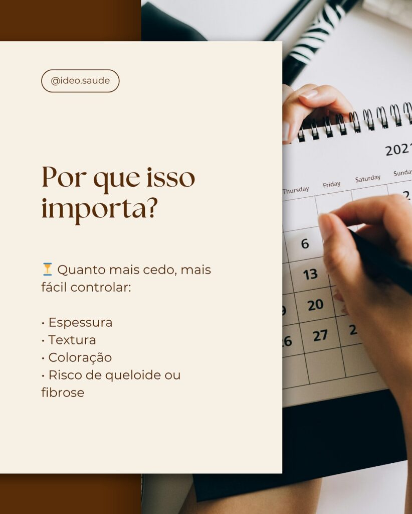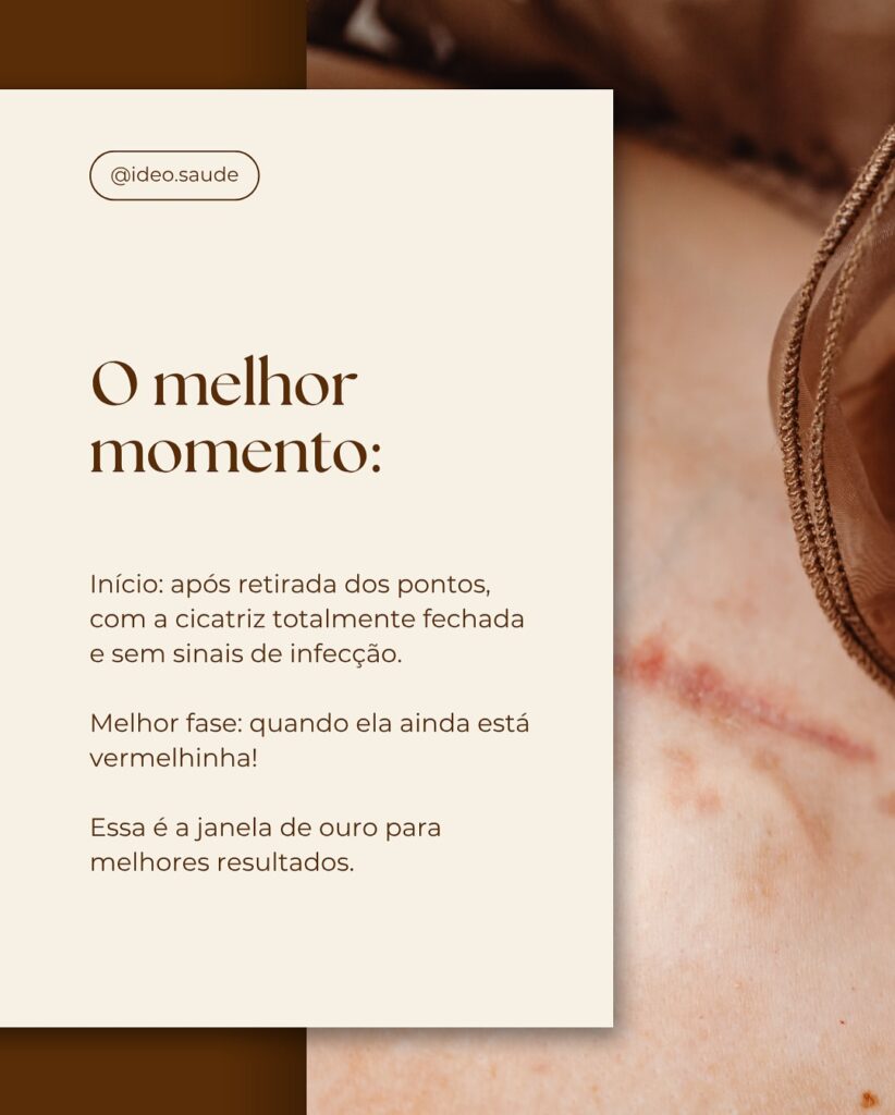 🔴 O melhor momento pra começar o tratamento da cicatriz é quando ela ainda está vermelhinha – ou seja, logo após a retirada dos pontos e com a região já fechada e sem infecção.